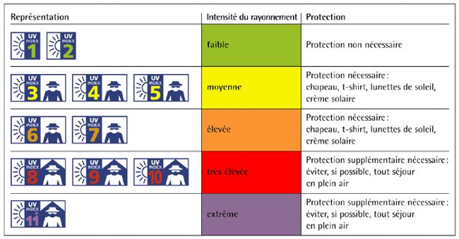 L'index UV est un indicateur simple de l'intensité du rayonnement UV du soleil. Ce rayonnement est d'autant plus fort et nuisible que l'index UV est élevé. Un coup de soleil s'attrape plus facilement lorsque l'index UV est élevé que lorsqu'il est faible. L'index UV permet de mieux estimer le danger du rayonnement solaire et de s'en protéger efficacement par des mesures appropriées. L'index UV exprime une valeur actuelle de mesure ou une prévision.